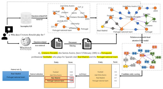However, building a complete KB involves many techniques, such as knowledge extraction, knowledge representation, and knowledge fusion, which require substantial time and resources. Therefore, a knowledge base is usually incomplete [7] and cannot cover all of the knowledge needed for QA. In addition, owing to the timeliness of knowledge, the limited update rate of a KB further exacerbates its lack of knowledge. Although previous research has proposed compensating for the lack of knowledge in the QA process by supplementing the incomplete KB or fusing textual information, answering questions from an incomplete KB remains a huge challenge with missing relations or even missing entities. One area of existing research [8,9,10] adopts KB embeddings to alleviate the sparsity of the KB by performing missing link prediction. These methods typically assume that the answer nodes exist in the KB, and an incomplete KB only lacks connection edges between entities; thus, the research focus is on completing the missing edges so that the answer nodes are reachable. In fact, in an incomplete KB, in addition to missing edges, entity nodes may also be absent. If the missing nodes happen to be the answer nodes, the aforementioned methods cannot handle such situations. These methods can only compensate for missing relations between entities by using KB embedding and cannot deal with missing entities in an incomplete KB. Another type of method [11,12,13] fuses extra textual information into the incomplete KB. However, these methods may introduce noise when integrating textual information. The fusion of different knowledge sources is another problem requiring a solution. Therefore, we consider the following current problems for incomplete KBQA: (i) In an incomplete KB, not only will missing relations affect the QA performance, but missing entities will also affect the recall of answers. Determining how to incorporate essential text into the KB to assist in answering questions is crucial. (ii) Whether supplementing the incomplete KB with sentences as nodes [11] or augmenting entity representation with textual information [12,13], current methods for fusing different knowledge sources are inadequate. Textual information requires question-related, fine-grained fusion to enhance QA effectiveness instead of introducing noise.