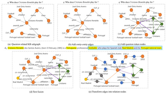 Perform text fusion: In the text fusion stage, the co-occurrence relation between entity mentions in the document is used to compensate for the missing entities and relations in the incomplete KB subgraph . Specifically, we use a fixed-size window to extract the co-occurrence entity pairs in the document and use the document context information and attention mechanism to learn the representation of the co-occurrence relation between each pair of entities, resulting in the representation vector of the specific co-occurrence relation between the entities. Suppose that contains an entity pair and their specific co-occurrence relation obtained from a document d. If and , where is the node set of the subgraph , then and and their corresponding co-occurrence relations are added to . If or , then the entity that does not belong to and the co-occurrence relations are added to . If and , but no edge exists between and , a co-occurrence relation is added between and . Figure 2d shows the subgraph obtained by text fusion, where the yellow vertex represents the entity supplemented by document . In this example, the entity “Real Madrid” is an answer to the question q, but it does not exist in the previously constructed question-related KB subgraph; rather, it exists in the supplementary document . Since this entity co-occurs with the topic entity within a window in the document, it is added to the subgraph, compensating for the missing entities in the incomplete KB.
