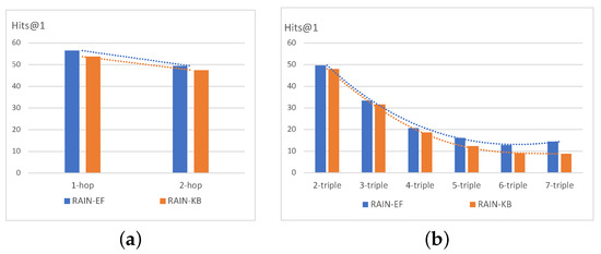 Figure 3a shows the performance of our RAIN-TF model for questions of varying difficulty on the WQSP dataset. The figure shows the Hits@1 results under the setting of KB. The experimental results indicate that the RAIN-TF model that fuses text outperforms the RAIN-KB model for both simple and complex questions, namely, one-hop and two-hop questions. Additionally, the results in Figure 3b on the CWQ dataset indicate that the performance of both RAIN-TF and RAIN-KB models declines as the number of triples increases (that is, with increasing question difficulty), and complex questions are indeed more difficult to answer. However, the performance of the RAIN-TF model decreases less sharply with increasing question difficulty than that of the RAIN-KB model, indicating that the text fusion method performs better on complex questions.