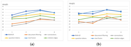 Figure 4a shows the trend of Hits@1 results with different numbers of model layers on the WQSP dataset. The experimental results show that the model with the best performance is the three-layer relation-aware interactive network, and Hits@1 reaches , which is 1.7% and 0.9% better than the results of the one-layer and four-layer models, respectively. In addition, the performance of RAIN-TF is better than that of the ablation model at all model levels. This finding proves that the effectiveness of each component of the model, especially the topic entity connections and the document classifier, can significantly improve the performance of the model. Figure 4b shows the trend of Hits@1 results with different numbers of model layers on the CWQ dataset. The experimental results show that the model that uses the three-layer relation-aware interactive network achieves the best performance, reaching 33.9%, which is 1.4% and 1.2% better than the results of the two-layer and one-layer models, respectively.