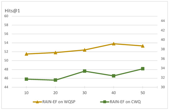 During the text fusion process, the window size for extracting co-occurring entities from the documents is also an important hyper-parameter. We tested the impact of different window sizes on the performance of the QA model under the setting of 50%KB and text fusion, setting the window sizes to {10, 20, 30, 40, 50}, and evaluated the performance of the RAIN-EF model on the WQSP and CWQ datasets. The experimental results in Figure 5 indicate that setting a larger window size (30–50) improves QA performance, with the optimal window size for the WQSP dataset being 40, while on the CWQ dataset, the optimal window size is 50, as CWQ is an extension of WQSP and has more complex questions, making larger window sizes more effective.