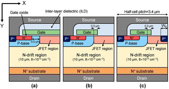 Sentaurus TCAD simulations were employed to design and analyze 1.2 kV SiC MOSFETs based on a half-cell size. Figure 1a–c show the 2-D schematic cross-sectional views of the 1.2 kV SiC C-MOSFET, SG-MOSFET, and PSG-MOSFET, respectively. A SiC N-drift region with a background doping concentration of 8 × 1015 cm−3 and a thickness of 10 μm on a SiC N+ substrate was implemented. All devices were designed with an inversion channel, an identical channel length of 0.5 μm and a gate oxide thickness of 50 nm. In order to ensure the reliability of the gate oxide, the SG-MOSFET and PSG-MOSFET were designed with an identical length of the overlap region of 0.3 μm between the poly-Si gate and JFET region. The JFET region was designed with a width of 1.5 μm, and a depth of 0.8 μm. Additionally, the JFET region of the C-MOSFET and SG-MOSFET was designed with a doping concentration (NJFET) of 3 × 1016 cm−3. Note that PSG-MOSFETs were designed with a higher NJFET than C-MOSFETs and SG-MOSFETs due to their reduced Eox,max. This can reduce the Ron,sp, which can minimize power dissipation during device operation.