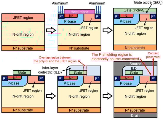All devices were created through following process simulations, and voltage was applied to each terminal of the devices to analyze its electrical characteristics through device simulations. Figure 2 shows the process simulation flow for the PSG-MOSFET. The PSG-MOSFET followed the same process flow as the C-MOSFET and SG-MOSFET. Note that all ion implantation processes used the Monte Carlo method for precision of simulations. The P-shielding region within the JFET region was formed through ion implantation for the P-source without any additional patterning steps. Additionally, the P-shielding region was designed with a depth of 0.5 μm and a width (WP) ranging from 0.3 μm to 0.9 μm. Furthermore, it should be noted that the P-shielding region is electrically connected to the source, which effectively improves the electrical characteristics of PSG-MOSFETs. In order to achieve this connection, a contact placement for simulation was created on the surface of the P-shielding region and subsequently merged with the source contact placement. Table 1 lists all device parameters used in TCAD simulations. Note that all device simulations were conducted with the same device area.