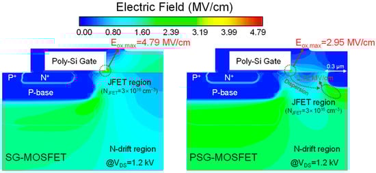 Figure 3 shows the electric field distribution of the SG-MOSFET in blocking mode with a VGS of 0 V and a drain-source voltage (VDS) of 1.2 kV. The SG-MOSFET exhibited an Eox,max of 4.79 MV/cm because electric field crowding occurs at the exposed edge of the poly-Si gate. The critical electric field of SiO2 in SiC MOSFETs is known to be 8–9 MV/cm [37]; however, the Eox,max should be to 3 MV/cm or less to ensure the reliability of the gate oxide in the device [38,39]. In contrast, the PSG-MOSFET with a WP of 0.3 μm achieved an Eox,max of 2.95 MV/cm, representing a 38.28% reduction compared to the SG-MOSFET. This reduced Eox,max of the PSG-MOSFET is due to the dispersion of the electric field from the gate oxide into the P-shielding region, which results in a maximum electric field in the P-shielding region of 2.32 MV/cm. In other words, the high electric field in the gate oxide is dispersed by the on-sided depletion region that occurs at the PN junction between the additional P-shielding region and the JFET region. Accordingly, this results in the suppression of the electric field crowding at the gate oxide of the PSG-MOSFET.