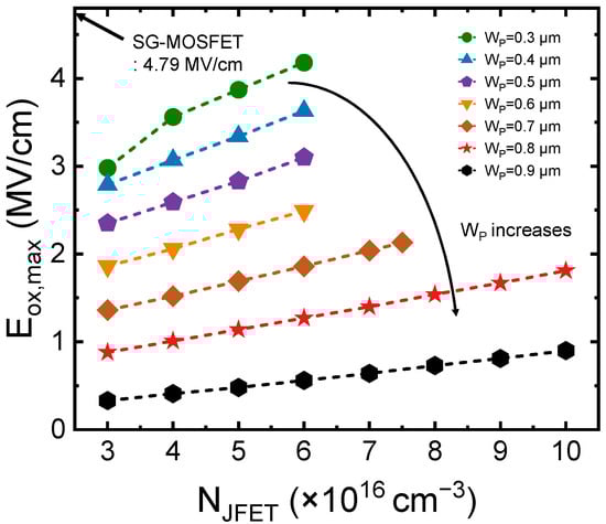 Figure 4 shows the Eox,max of PSG-MOSFETs according to the WP and NJFET. As the NJFET increases, the Eox,max also increases due to a reduction in the width of the depletion region of the P-shielding region. Conversely, as the WP increases, the Eox,max significantly decreases. Since an increase in Ron,sp denotes an increase in conduction loss during device operation, optimization of NJFET and WP is crucial. These results indicate that the P-shielding region can effectively suppress electric field crowding at the gate oxide, despite the higher NJFET of PSG-MOSFETs compared to the SG-MOSFET.