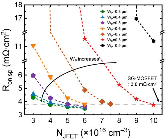 Figure 5 shows the Ron,sp of PSG-MOSFETs according to the WP and NJFET. As the NJFET increases, the Ron,sp decreases due to the expansion of the current path of the device in the conduction mode. Conversely, as the WP increases, the Ron,sp significantly elevates. In particular, the PSG-MOSFET (WP = 0.9 μm and NJFET = 1 × 1017 cm−3) exhibits a Ron,sp of 11.41 mΩ∙cm2. In order to achieve an identical Ron,sp as the SG-MOSFET, it is required to design the NJFET of the PSG-MOSFET with a WP of 0.9 μm to be much higher than 1 × 1017 cm−3. However, the implementation of a significantly higher NJFET results in a reduction in the Vth of the device. For the design of the inversion channel, the WP with a range of 0.3 μm to 0.8 μm was employed, and devices with an identical Ron,sp as the SG-MOSFET were selected, as shown in Table 2.