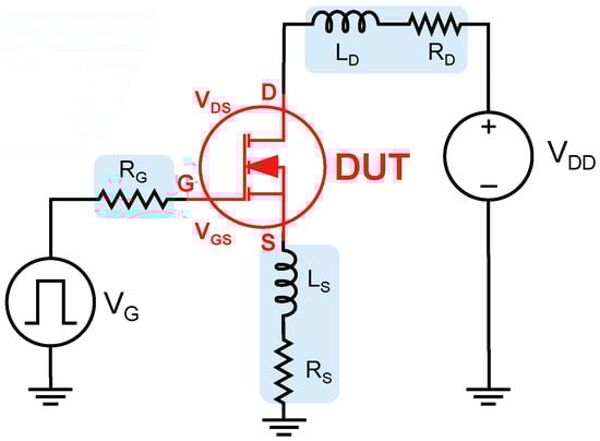 Silicon carbide (SiC) devices, including Schottky barrier diodes (SBDs) and metal oxide semiconductor field-effect transistors (MOSFETs), have become key components in power electronic systems [1,2,3]. SiC devices offer a low specific on-resistance (Ron,sp), superior blocking capability, and excellent thermal conductivity compared to silicon (Si) insulated gate bipolar transistors (IGBTs) [4,5,6]. Furthermore, the fast switching speed of SiC devices, operating at frequencies exceeding 100 kHz, can achieve the advantage of reducing the volume of passive components in power electronic systems [7]. In particular, the utilization of SiC MOSFETs as switching components is becoming increasingly prevalent in DC–DC converters, on-board chargers, and inverters for electric vehicles due to their superior performance [8,9,10].