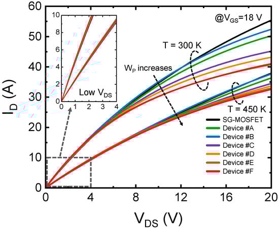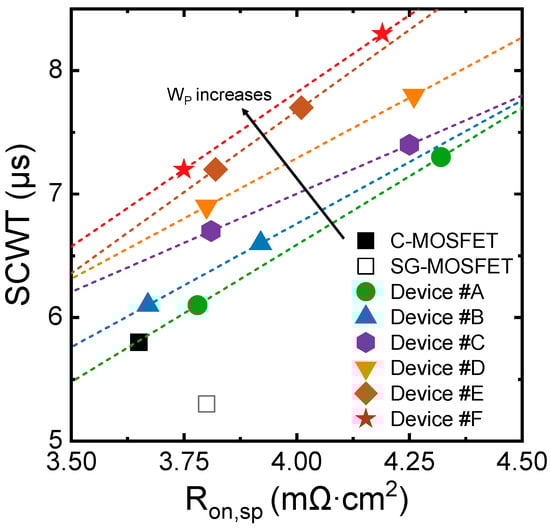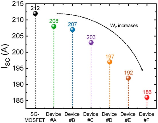 Figure 7 compares the SCWT and Ron,sp of all the devices. The C-MOSFET has a Ron,sp of 3.65 mΩ∙cm2 and SCWT of 5.8 μs. By comparison, the SG-MOSFET exhibits a 4.11% increase in Ron,sp (3.8 mΩ·cm2) and an 8.62% decrease in SCWT (5.3 μs), indicating a less favorable trade-off between SCWT and Ron,sp than the C-MOSFET. In contrast, the PSG-MOSFET achieves a superior trade-off between SCWT and Ron,sp as the WP increases. Accordingly, it is observed that Device #F (NJFET = 1 × 1017 cm⁻3 and WP = 0.8 μm) exhibits the best trade-off between SCWT and Ron,sp. Note that PSG-MOSFETs did not make any sacrifices of static characteristics, including the Ron,sp, to achieve enhanced SC robustness.