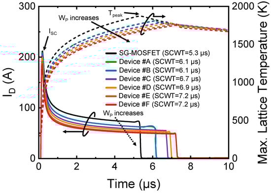 Figure 8 shows the SC characteristics of all the devices. Additionally, the solid line indicates the ID, while the dotted line denotes the maximum lattice temperature. Note that all the devices exhibited thermal runaway and drain surge current at the gate pulse duration of the SCWT. PSG-MOSFETs demonstrate enhanced SC robustness compared to the SG-MOSFET with identical Ron,sp. It is important to note that the proposed device reduces the probability of device failure due to thermal runaway under SC conditions, and does not require the sacrifice of static characteristics such as the Ron,sp to achieve this. Meanwhile, as WP increases, PSG-MOSFETs exhibit a decrease in the peak drain current under SC conditions (ISC) and peak value in maximum lattice temperature (Tpeak).