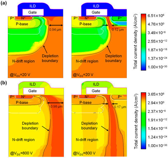 Figure 10 shows the output characteristics of the SG-MOSFET and PSG-MOSFETs. Due to the comparable slope of devices at low VDS, PSG-MOSFETs can achieve a Ron,sp similar to that of the SG-MOSFET. In contrast, it is observed that PSG-MOSFETs rapidly saturate the drain current at higher VDS compared to the SG-MOSFET. Furthermore, this tendency appears to intensify as the WP increases. This indicates that the ISC is proportional to the drain saturation current (ID,sat). Figure 11 shows the total current density of the SG-MOSFET (on the left) and Device #F (on the right) in conduction mode (at a VDS of 20 V) and under SC conditions (at a VDS of 800 V). Device #F exhibits a wider depletion region within the JFET region compared to the SG-MOSFET in conduction mode and under SC conditions. The narrower current path facilitated by the P-shielding region can effectively suppress the ID,sat under SC conditions. According to Equation (1), the ID,sat is inversely proportional to SCWT [40]. Thus, the reduction in ID,sat can enhance the SC robustness of PSG-MOSFETs.
