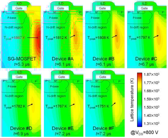 Lattice temperature distribution of the SG-MOSFET and Devices #A–#F under SC conditions.