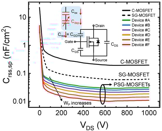 The Crss,sp characteristics of all the devices were obtained at 1 MHz through TCAD mixed-mode simulation, as shown in Figure 13. Additionally, the Crss,sp is normalized as the device area. The SG-MOSFET exhibits lower Crss,sp than the C-MOSFET, which is a result of the split gate structure. However, the P-shielding region of PSG-MOSFETs has the effect of expanding the depletion region, which results in a reduction in depletion capacitance (Cdep). As a result, PSG-MOSFETs exhibit significantly lower Crss,sp than the SG-MOSFET, according to Equation (3). Meanwhile, as the WP increases, the Crss,sp of PSG-MOSFETs is effectively further reduced.