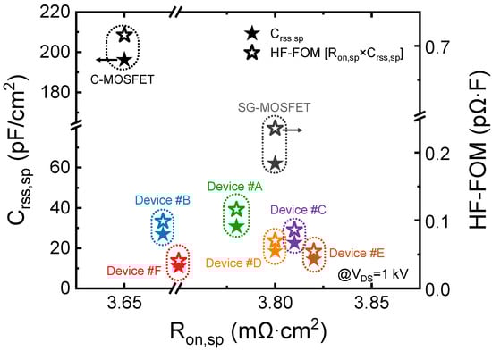 Comparison of the Ron,sp, Crss,sp, and HF-FOM in the C-MOSFET, SG-MOSFET, and Devices #A–#F.