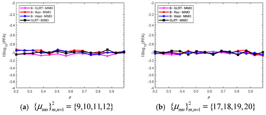 Figure 1 shows the probability of false alarms (PFAs) under different clutter covariance parameters with a fixed detection threshold. For convenience, all are set to be the same, i.e., . It can be seen from Figure 1 that the PFA remains basically constant, which verifies that the proposed detectors have the characteristic of constant false alarm rate (CFAR) properties.