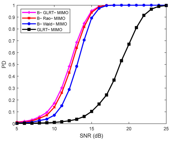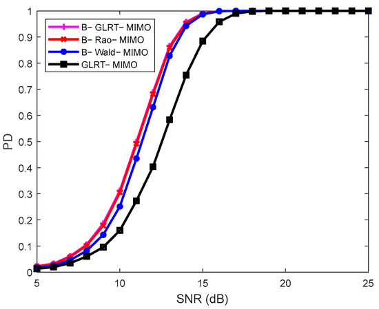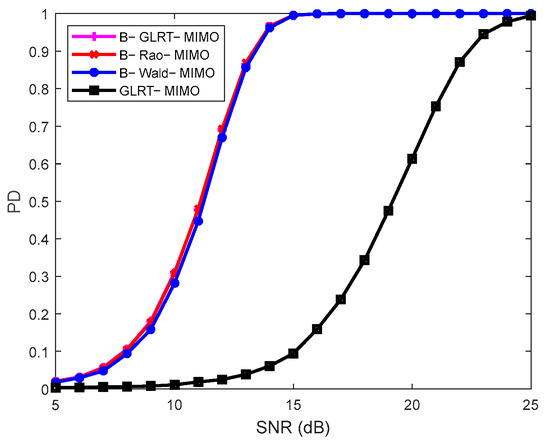 The parameters in Figure 4 are the same as those in Figure 2, except for the increase in the number of training samples. Compared with the results in Figure 2, it can be seen that the detection performance of each detector has improved, especially for the conventional detector GLRT-MIMO. However, it still has lower PD than the Bayesian detectors, and B-GLRT-MIMO also has the highest PD.