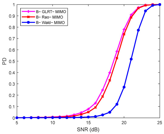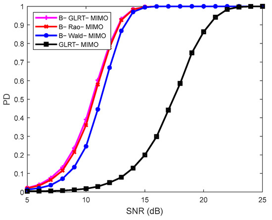 This Section evaluates the detection performance of the proposed Bayesian detectors B-GLRT-MIMO, B-Rao-MIMO, and B-Wald-MIMO. To decrease the computational demands, the PFA is set to be . To determine the detection threshold, data simulations are used. To ascertain the probability of detection (PD), data simulations are conducted. The element of the Bayesian scalar matrix is set to be