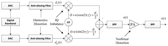 IQ modulation is used in many communication systems due to its simple structure. However, there exist imperfections in the components in the baseband and RF front-end circuits of the transmitter, which are mainly caused by nonlinear devices, resulting in a distorted version of the transmitted signal rather than ideal signal [7]. Its structure is shown in Figure 1. The main damages are as follows.