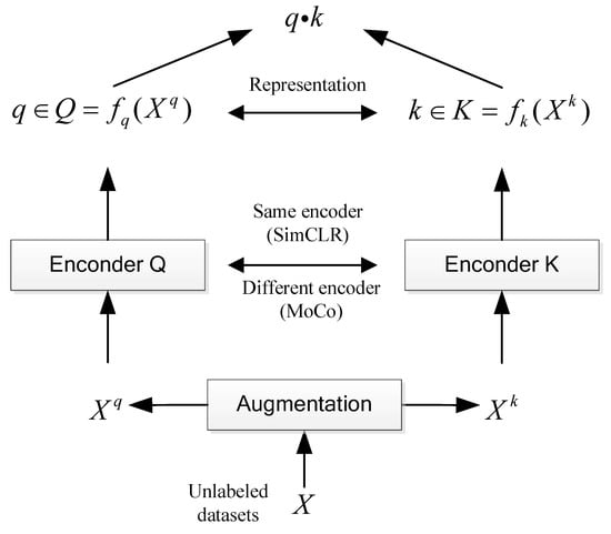 where q and k denote the feature vectors of the output for two encoders, respectively, is the transpose operation, is the temperature parameter, and K denotes the number of negative samples of q.