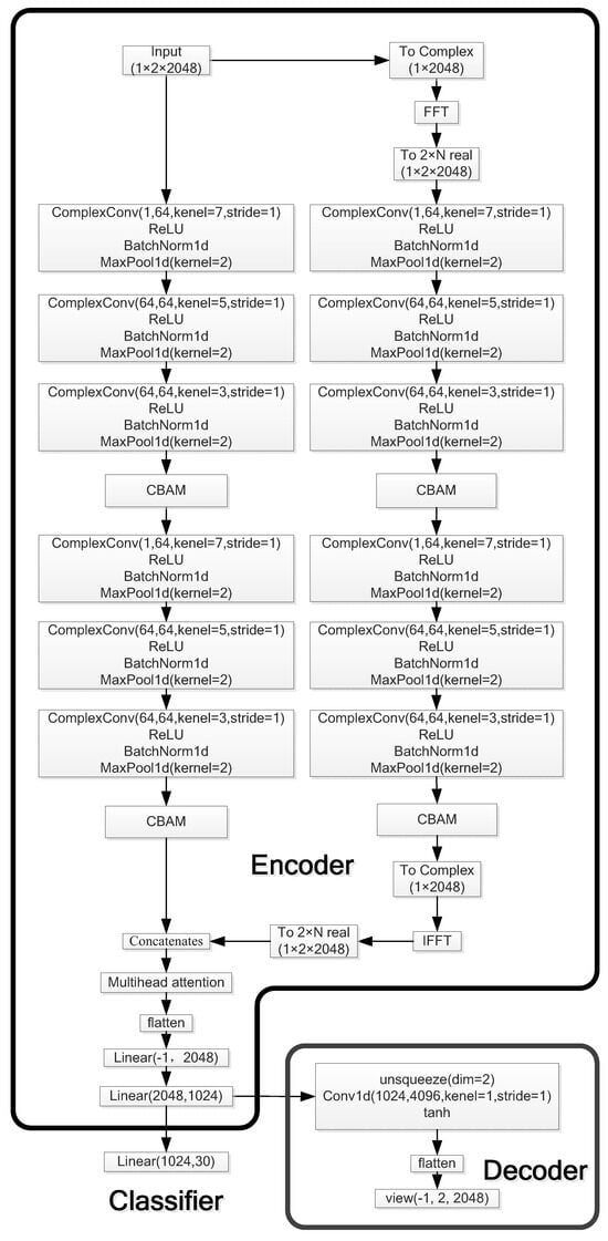In the proposed model, the input sample is a 2 × 2048 unlabeled IQ baseband signal received by a receiver. In the time domain, two convolutional blocks are included: one composed of CVNNs with three different receptive fields and two CBAM blocks composed of channels and spatial attention mechanisms. Meanwhile, I and Q branches of the input signal are formed as a complex-valued sequence, and then the real and imaginary parts of the fast Fourier transform (FFT) output are converted back into a 2 × 2048 sequence. This sequence is then fed into another network with the same structure of the time domain, and the output of this network is then transformed into a 2 × 2048 sequence by an inverse process. The time-frequency domain outputs are then merged and a multi-head self-attention mechanism is added, followed by flattening and passing through a two-layer fully-connected layer that feeds into the decoder consisting of a 1 × 1 convolutional layer. The loss function is .
