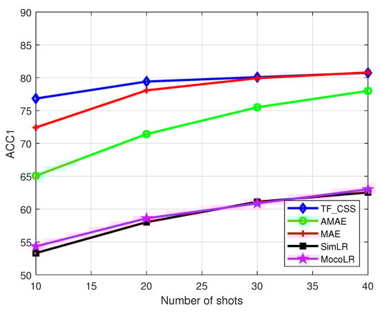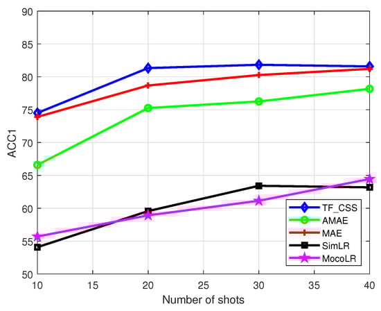 Figure 5, Figure 6 and Figure 7 show in more detail the relationship between ACC1 and Shot and the observation length for the five methods. It can be seen that the general trend is that as the shot number and observation length get larger, the ACC1 gets larger. However, the larger the observation length, the accuracy sometimes does not necessarily increase dramatically, and this occurrence actually verifies that the signal is periodic and that multiple cycles do not necessarily result in a large gain in accuracy. This suggests that sending data with a high degree of diversity is more beneficial for training. Moreover, especially when there are fewer samples, the performance of TF-CSS is more efficient than the other methods, but this advantage becomes smaller and smaller when there are more samples, especially for the three methods based on the mask autoencoder. Finally, the ACC1 performance of the MAE-based models is generally higher than that of the contrastive learning-based models.