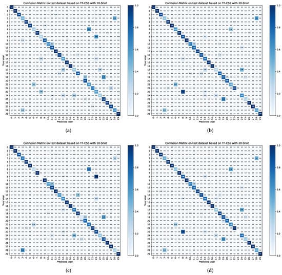 Four confusion matrix diagrams of the TF-CSS method under different observation lengths (2048 and 8192) and different few-shot (10 and 20). (a) Observation lengths: 2048, shot numbers: 10. (b) Observation lengths: 2048, shot numbers: 20. (c) Observation lengths: 8192, shot numbers: 10. (d) Observation lengths: 8192,shot numbers: 20.