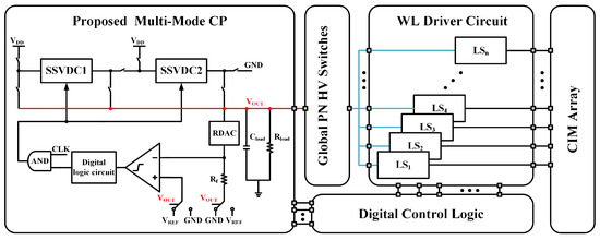 This paper presents a novel multi-mode CP (MMCP), which uses only a single CP to generate both PN HVs required by the CIM array in different modes. We control the switches using three global LSs, altering the cascade configuration and the input–output direction of the single-stage voltage-doubling circuits (SSVDCs) in the MMCP. When the MMCP operates in the convolution operation mode, the SSVDCs are connected in parallel to enhance the drive capability. In addition, the MMCP is designed in a standard 55 nm CMOS process with an area of only 0.021 mm2. The rest of this paper is organized as follows: Section 2 describes conventional PN CPs, Section 3 presents the MMCP, Section 4 discusses and analyzes the post-simulation results, and finally, a conclusion is drawn in Section 5.