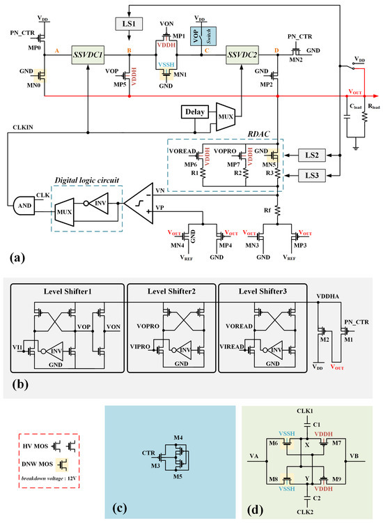 (a) Structure of the MMCP; (b) LSs in the MMCP; (c) dynamic bias circuit of the substrate used in the switch; (d) structure of the SSVDC used in the MMCP.