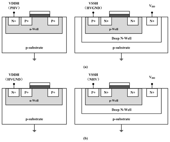 Substrate bias schemes for some DNW MOSs and HV PMOSs. (a) Positive CP mode; (b) negative CP mode.