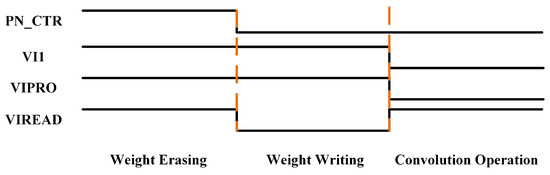 Timing diagram of the MMCP mode switching. Following the depicted sequence, the MMCP can perform weight erasing, weight writing, and convolution operation.