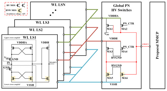 In this study, the MMCP is designed to generate diverse PN HVs from a single CP. Since the PN voltages are output from the same port (at different times), they must be selected by global PN HV switches to be properly connected to the upper/lower power rails of the WL driver circuits.