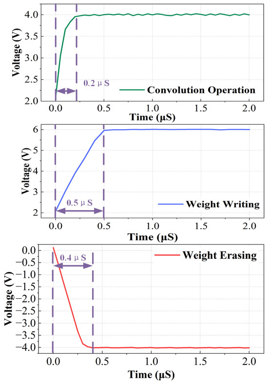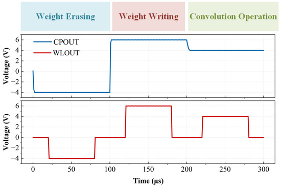 The MMCP is designed in 55 nm CMOS technology. In addition, the HV transistors used in this study (including DNW MOS) have a voltage rating of approximately 12 V. All the transistors operate within their safe voltage ratings. The MMCP’s layout is shown in Figure 11, with an area of 0.021 mm2. Figure 12 illustrates the delay of the MMCP operating in different modes. The supply voltage is 2.5 V, the capacitive load is 100 pF, the operating frequency is 25 MHz, and the current load is 50 A. The maximum delay occurs in the weight erasing mode, with a delay of 0.5 s, while the delay in the convolution operation mode is 0.2 s. The delay across different modes arises from the varying driving capabilities provided by the MMCP in each mode, leading to differences in response speed and delay characteristics. Figure 13 shows the output waveform of the MMCP, as well as the voltage values applied to the WLs of the CIM array after the output waveform is gated by the WL driver circuits. The voltage value of 0 V applied to the CIM unit’s WL indicates that the row device is unselected, while voltage values of −4 V, 6 V, and 4 V correspond to the weight erasing, weight writing, and convolution operation modes, respectively. Table 2 presents the power consumption for the MMCP operating in various modes, with a current load of 50 A. The power consumption of a CP is proportional to its switching frequency, and high-frequency switching leads to increased switching losses. The MMCP operates at a clock frequency of 25 MHz, avoiding the additional losses associated with high-frequency switching while maintaining the MMCP’s operational efficiency. Additionally, the MMCP uses a two-phase non-overlapping clock, effectively preventing current backflow and unnecessary energy dissipation, thus reducing power consumption. Furthermore, HVGND provides standby voltage to the unselected CIM devices, reducing their voltage requirements for the MMCP. This approach enhances the energy efficiency of the MMCP and further reduces the overall system power consumption. Through these optimizations, the MMCP achieves lower power consumption while maintaining performance.