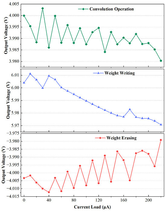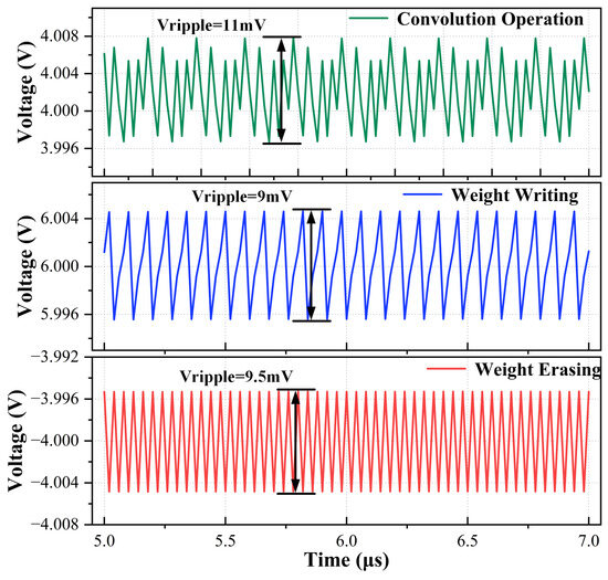 Figure 14 shows the output ripple of the MMCP operating in different modes. With a supply voltage of 2.5 V, a of 100 pF, and an of 50 A, the maximum ripple of the MMCP is 11 mV in the convolution operation mode, with an error of 0.28%, which is within the acceptable range for regular operation of the device.