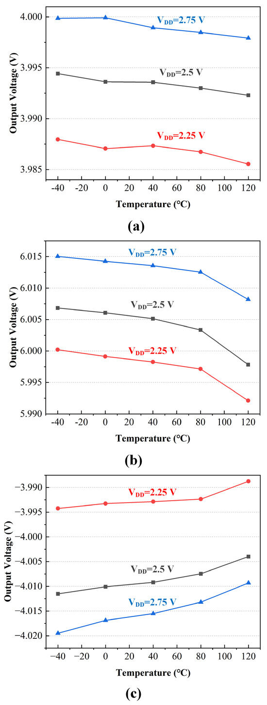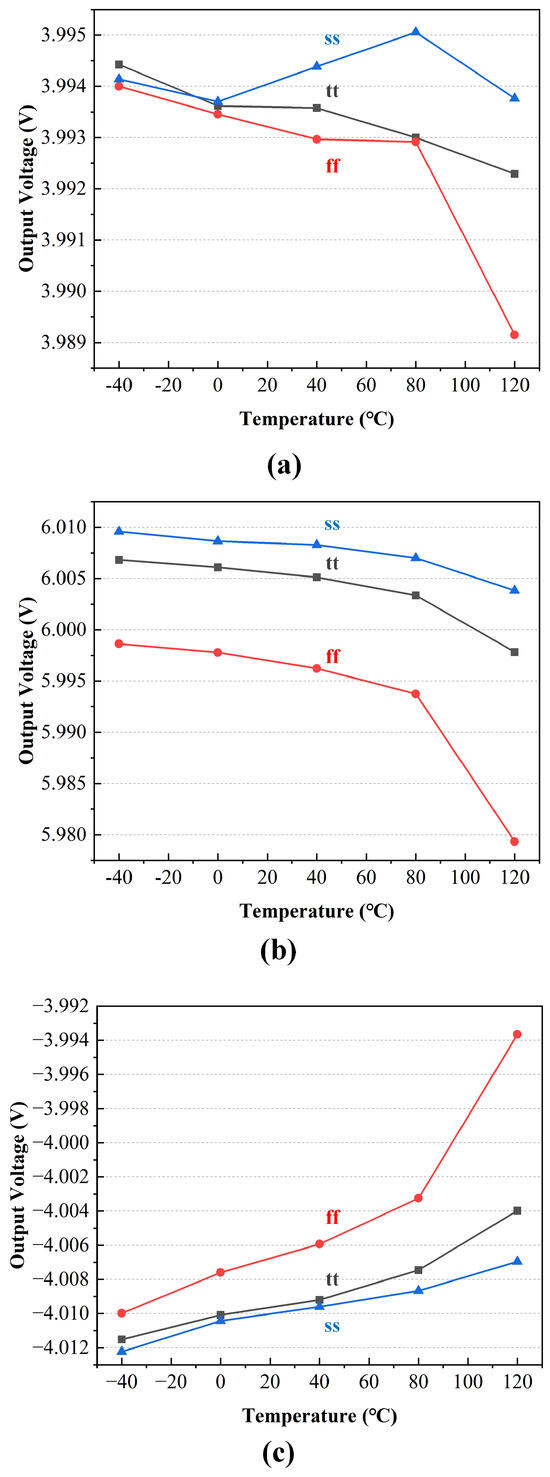 Figure 15 shows the relationship between the output voltage and current load of the MMCP operating in different modes. Due to the effect of the MMCP’s output impedance, the output voltage decreases accordingly. The output voltage deviation of the MMCP does not exceed 0.5%, which meets the operational requirements of the CIM array when the output current load ranging from 0 A to 220 A. Figure 16 presents the relationship between the output voltage and the MMCP’s power supply voltage in different operation modes. The supply voltage fluctuates from 2.1 V to 3.2 V with a current load of 50 A, and the output voltage can meet the operational requirements. Figure 17 illustrates the output voltage of the MMCP related with temperature and supply voltage in different modes. Figure 18 shows the output voltage of the MMCP related with temperature and process corners in different modes. Over the temperature range of −40 °C to 120 °C, with supply voltage fluctuations of ±10%, and the effects of tt/ff/ss process corners, the DC output voltage of the MMCP changes across different modes, particularly under high temperature and the ff process corner. However, these variations remain within acceptable limits, as the errors do not exceed 0.5%.