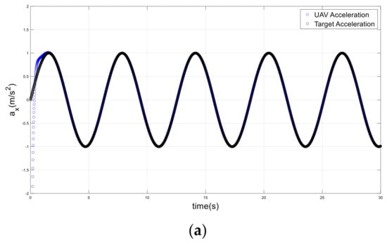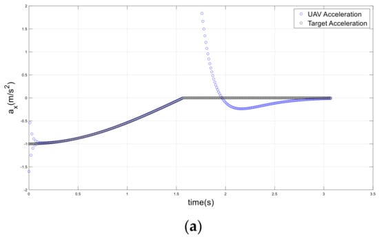 More simulations were implemented to investigate the performance of a UAV under various accelerating pathways and different limitations. In all of the following simulations, the previous tuned parameters are used (i.e., , and = (20, 8, 0.2), and ). Figure 6 illustrates the first challenging scenario, where the UAV was tracking a target accelerating at . The UAV and target were 10 m apart at the beginning. Despite the fact that they were at different speeds and accelerations, the UAV managed to hit the target.