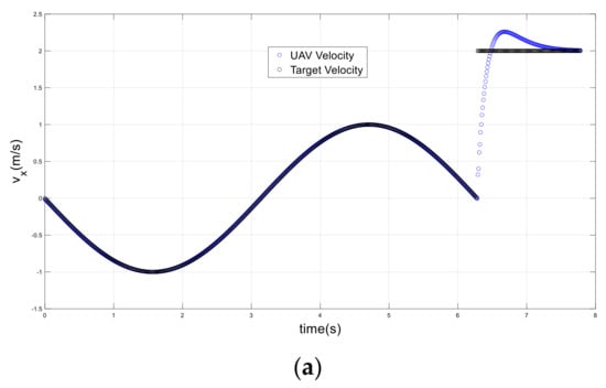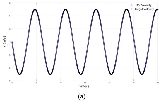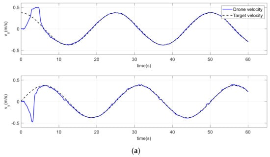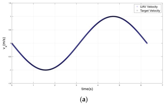 Velocities of the drone and target on a circular path; (a) x-axis, (b) y-axis.