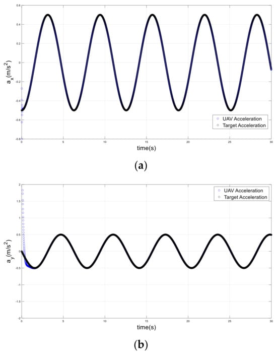 UAV and target accelerations in a sudden stop scenario; (a) x-axis, (b) y-axis.