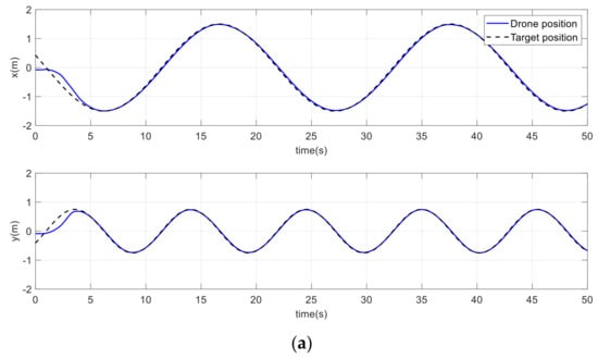 In a circular path scenario, the target was moving in a 1.5 m circle at a height of 1 m. Furthermore, the target should move at velocities of [−0.4, 0.4] m and an acceleration of [−0.1, 0.1] . Figure 26a,b show how the drone tracked the target while accounting for and ignoring the acceleration term, respectively.