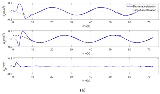 Accelerations of the drone and target on a helical path; (a) x-axis, (b) y-axis, (c) z-axis.