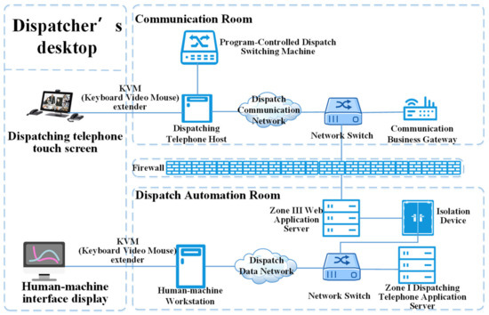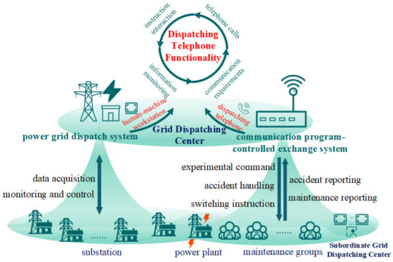 The power grid dispatch system and the communication program-controlled exchange system are the cornerstones of the safe operation of the power grid [1,2,3,4,5,6]. The power grid dispatch business and telecommunications business involved in each of them are the daily tasks handled by dispatchers at all levels of power grid companies. As shown in Figure 1, dispatchers on duty must use the human–machine workstation of the power grid dispatch system to monitor information while also utilizing the dispatching telephone of the communication program-controlled exchange system to complete communication interactions with the maintenance groups at the substation and power plant. In the current practice of power grid dispatching, a significant number of dispatching commands and operational communications rely on the dispatching telephone functionality of various levels of dispatching institutions. When a fault occurs in the power grid, dispatchers are confronted with a large volume of monitoring signals and communication demands. It is easy to produce harmonic mispronunciation, busy telephone lines, and step operation, which greatly affects work efficiency and power grid operation safety [7]. Therefore, the dispatching telephone functionality carries the coordinated operation of grid information monitoring and communication interaction at all levels, and it is the connection point between the power grid dispatch business and the telecommunications business.