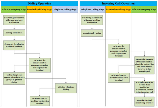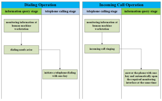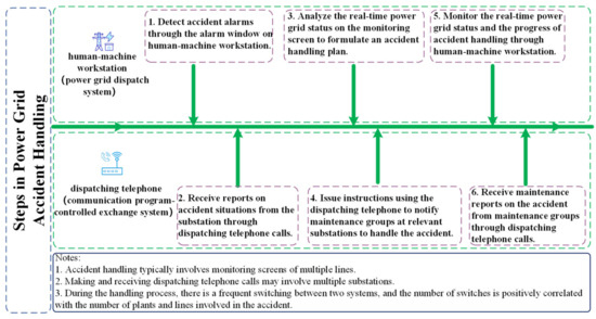 The power grid dispatch system is an automated system oriented towards the dispatching production operations of power grids, and the communication program-controlled exchange system is a voice communication system for power production dispatching commands that employs circuit-switching technology for networking. According to the research and statistics of SGCC (State Grid Corporation of China), it has been identified that the existing power grid dispatch system is compromised by inefficient telecommunications business, which in turn disrupt the concentration of dispatchers [8,9]. Furthermore, the current communication program-controlled exchange system is not compatible with the “informatization, automation, and interactivity” requirements that are integral to the operation of smart grids [10,11]. According to the statistics, the average time for each dispatching telephone functionality operation during dispatcher duty is about 8 s. As the volume of business increases year by year, dispatchers at all levels of SGCC commonly report that the steps for operating the dispatching telephone are cumbersome and time-consuming. Additionally, in the context of accident handling, dispatchers need to perform about six to eight dispatching telephone operations for each handling. During an 8 h duty cycle, they need to handle about 20 to 50 accidents or abnormal alarms, resulting in a total of about 200 dispatching telephone operations and a substantial total time loss. Taking accident handling as an example, Figure 2 shows the related steps of the dispatching telephone operations. During the accident handling process, there is frequent switching between two systems, and the number of switches is positively correlated with the number of substations and lines involved in the accident. In cases of severe weather, the increase in grid accidents leads to even more frequent operations of the dispatching telephone.