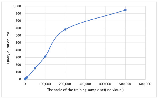 The relationship between the size of the training sample set and the query duration was statistically analyzed, as shown in Figure 8. Based on an evaluation of the data generated by a single grid dispatching center with 50,000 dispatching telephone functionalities per year, the query duration of this method is deemed feasible.