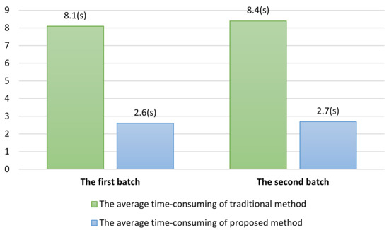 The experiment was divided into two batches, each conducting 200 dispatching telephone functionality operations. Through the testing of the intelligent call software for dispatching telephones, the time consumption of the dispatching telephone functionality operations during dispatcher duty can be reduced to about 5.6 s (reduce 67.9%), effectively shortening the time consumption of the dispatching telephone functionality operations, as shown in Table 4 and Figure 10.