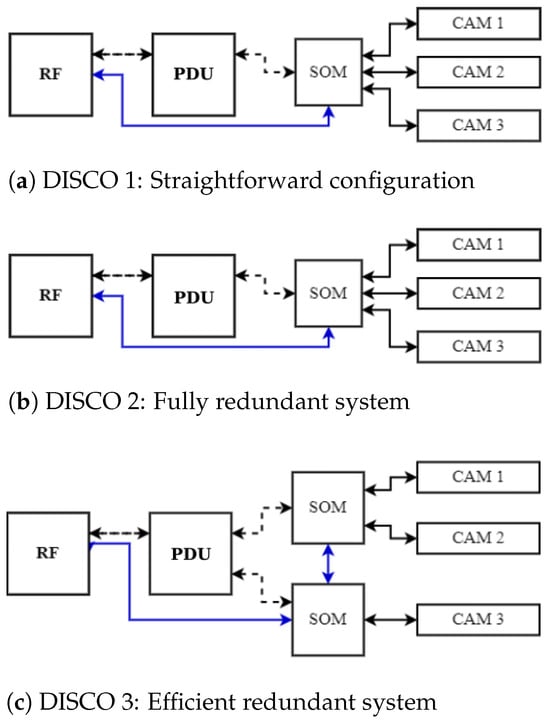 - Design 3: To obtain redundancy and keep the power consumption low, two cameras are connected to one SoM, and the last camera to another SoM. The PDU is the communication bridge between SoMs. Nevertheless, if one SoM fails, the other cannot take over the cameras.
