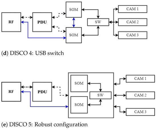 - Design 1: It is the most straightforward configuration since it uses one single SoM, and the cameras are attached to it by individual USB ports. The PDU powers on/off the system and sends messages by CAN protocol. Finally, an extra communication protocol is set to send the images directly to the RF module. However, if the SoM fails, the cameras do as well.