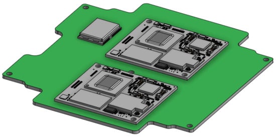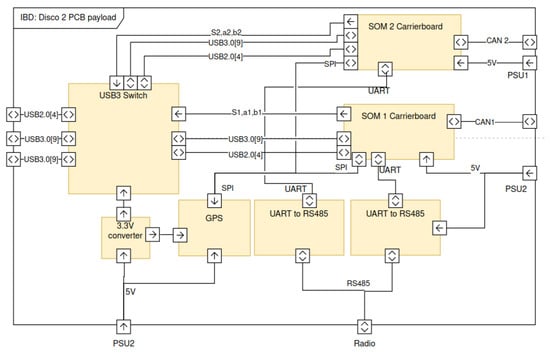 The ML payload is briefly described as follows. The IPU, which is the SOM, triggers image capture using the wide field and telephoto cameras. Then, it applies an ML model to recognize if each image contains relevant information to be sent to the ground station through the radio module. The SOM contains a co-processor that allows accelerated machine learning applications to analyze images. This procedure must be performed because the satellite has a limited bandwidth to download data. Furthermore, the satellite PDU has two channels available to provide power to the payload. The SOM modules that are capable of this image processing task use more power than can be provided by the PDU continuously. Thus, the SOM must be in sleep mode for the majority of an orbit to save energy, waking only during observation and transmission. These duty cycles are modeled in other work by the group. Furthermore, the CSP network onboard the satellite is based on CANBUS and has limited bandwidth, and the payload needs an extra communication network to send the images directly to the radio module. The software integration aspect tends to match the operation between the cameras and the image processing unit. Redundancy features are integrated to ensure robustness, providing fail-safe mechanisms in case of unforeseen circumstances. The system is engineered to minimize power consumption, promoting energy efficiency. Seamless communication integration facilitates data exchange between the cameras and the processing unit. However, some hardware designs were developed to reach the requirements mentioned above, which are described as follows: