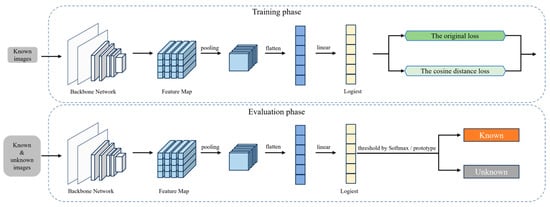The proposed framework for OSR operates in two stages (Figure 1): (1) Training phase: Backbone networks (e.g., ResNet50) extract features from KCs, which are pooled, flattened, and passed through a fully connected layer to generate logit prediction scores. CDLoss is added to the original loss to be used in calculating the total loss. Through the backpropagation algorithm, the model computes the gradients of the model parameters based on this total loss. These gradients reflect how the loss function changes with respect to each parameter, guiding the direction in which the model parameters should be updated. Subsequently, the optimizer leverages this gradient information to adjust the model parameters in order to minimize the total loss. (2) Testing phase: A prediction score is computed for each test sample, either through Softmax normalization or by calculating the distance between the sample’s feature vector and the class prototype centroid. This score is compared to a threshold to classify the sample as belonging to a KC or UC.