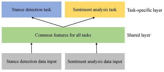 The MTL model designed in this paper consists of a shared layer and task-specific layers, aiming to perform both stance detection and sentiment analysis. The model structure is shown in Figure 1. In this architecture, the shared layer extracts general features from the input data for both stance detection and sentiment analysis, which are shared across all tasks. On the other hand, the task-specific layers are tailored for each task, extracting specific features from the shared general features for stance detection and sentiment analysis, respectively. In the same network, the task-specific layers do not share weights, allowing each task to extract task-specific information from the shared features. This design effectively utilizes the relationships between tasks, enhancing data efficiency and improving the model’s generalization ability by using a shared feature extractor. At the same time, the task-specific layers allow for customized outputs for each task, enabling the personalized processing of different tasks.