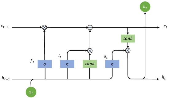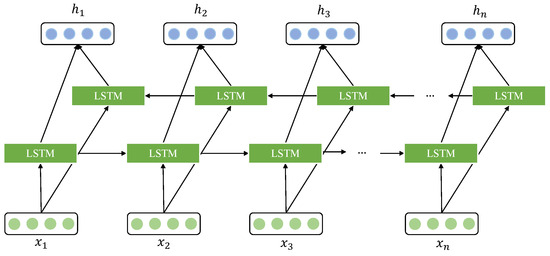 To address the issue of long-term dependencies, LSTM [28] enhances RNN by introducing gating mechanisms that control the flow of information in and out of the network. The structure of the LSTM model is shown in Figure 6. To better capture contextual semantic information, BiLSTM [29] concatenates two LSTM layers: one processes the forward sequence, while the other processes the backward sequence, as shown in Figure 7.