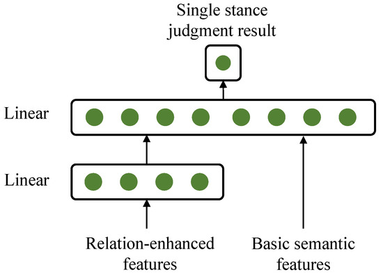 To further extract sequence features from the text and enhance the relational features between the comment text and the target topic, the semantic feature vectors extracted by the RoBERTa model are split into two equal-length parts. These are then fed into a BiLSTM model to extract deeper global sequential features. We design three modules corresponding to the three stance categories: support, opposition, and neutral. Each module uses a fully connected layer to integrate the relation-enhanced features and combines them with the base semantic features. These features are further integrated through a fully connected layer, reducing the feature length to 1. This transforms the stance detection task from a three-class classification problem into three binary classification problems, reducing the complexity of the problem. The structure for single-stance judgment is shown in Figure 8. Finally, the three feature vectors of length 1 are merged and processed by a softmax activation function to output the final stance classification result.