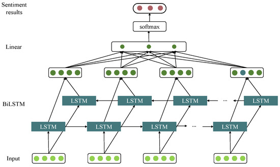 In the sentiment analysis module, a BiLSTM layer is first used to extract emotional features, followed by a fully connected layer for dimensionality reduction. The results are then passed through a sigmoid function for binary classification using the softmax operation, yielding the final sentiment analysis result. The structure of the sentiment analysis module is shown in Figure 9.